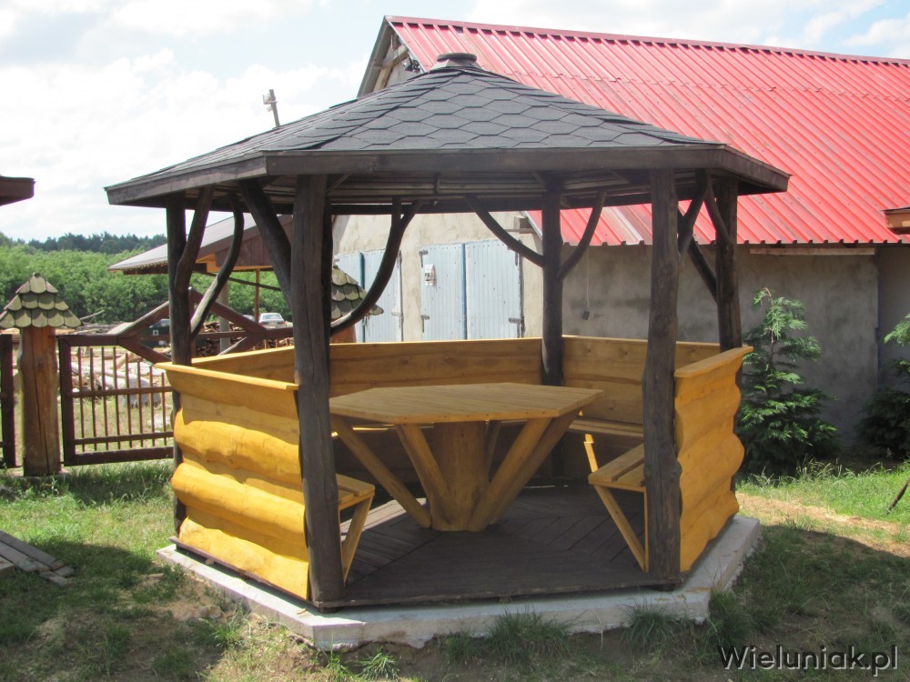 1. Słupy altany wykonane z bali z naturalną krzywizną średnicy ok. 12 cm, wys. całkowita do 270 cm,