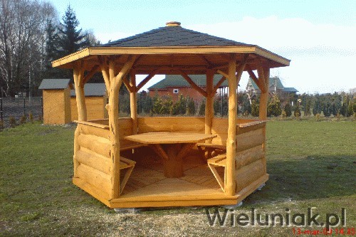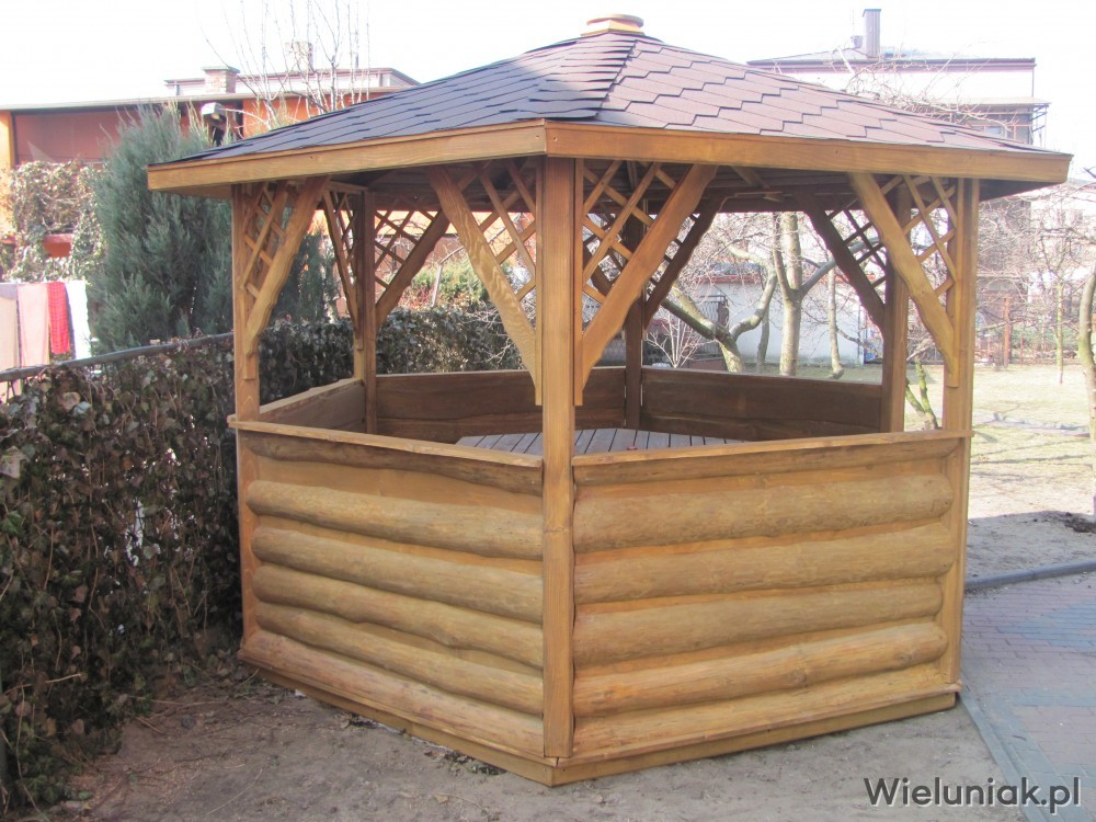Altany ogrodowe wykonywane są z drewna sosnowego. Każda altana drewniana jest ustawiana na odpowiednio rozmieszczonych i wypoziomowanych podkładach betonowych, które zabezpieczają przed gromadzeniem się wody pod podłogą altany i zapewniają cyrkulację powietrza pod podłogą. Stosujemy również agrowłókninę, której zadaniem jest zapobieganie przerastaniu roślinności między deskami podłogowymi. Słupy altany mają wysokość 200 cm, natomiast całkowita wysokość altany wynosi 270 cm. Dachy altan wykonane są z desek boazeryjnych oraz pokryte gontem bitumicznym co zapewnia długoletnią trwałość każdej altany oraz odpowiednie wrażenia estetyczne. Każda z altan wyposażona jest w zestaw mebli, na który składają się stół z sześciokątnym blatem oraz 5 ławek, zamocowanych do altany. Wszystkie elementy altany są odpowiednio strugane oraz dwukrotnie impregnowane. Na życzenie klienta możemy zamontować w altanie oświetlenie oraz dodatkowe kratownice. Wszystkie altany montujemy samodzielnie. Dostarczamy nasze produkty na terenie Polski oraz zagranicę. Koszty transportu uzgadniamy indywidualnie z każdym klientem.