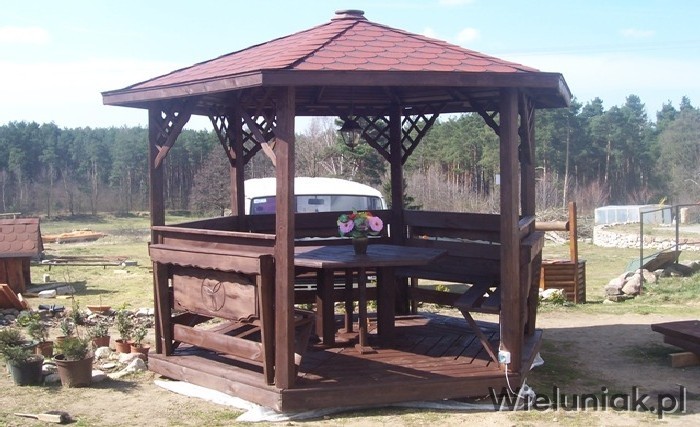 Altany ogrodowe wykonywane są z drewna sosnowego. Każda altana drewniana jest ustawiana na odpowiednio rozmieszczonych i wypoziomowanych podkładach betonowych, które zabezpieczają przed gromadzeniem się wody pod podłogą altany i zapewniają cyrkulację powietrza pod podłogą. Stosujemy również agrowłókninę, której zadaniem jest zapobieganie przerastaniu roślinności między deskami podłogowymi. Słupy altany mają wysokość 200 cm, natomiast całkowita wysokość altany wynosi 270 cm. Dachy altan wykonane są z desek boazeryjnych oraz pokryte gontem bitumicznym co zapewnia długoletnią trwałość każdej altany oraz odpowiednie wrażenia estetyczne. Każda z altan wyposażona jest w zestaw mebli, na który składają się stół z sześciokątnym blatem oraz 5 ławek, zamocowanych do altany. Wszystkie elementy altany są odpowiednio strugane oraz dwukrotnie impregnowane. Na życzenie klienta możemy zamontować w altanie oświetlenie oraz dodatkowe kratownice. Wszystkie altany montujemy samodzielnie. Dostarczamy nasze produkty na terenie Polski oraz zagranicę. Koszty transportu uzgadniamy indywidualnie z każdym klientem.