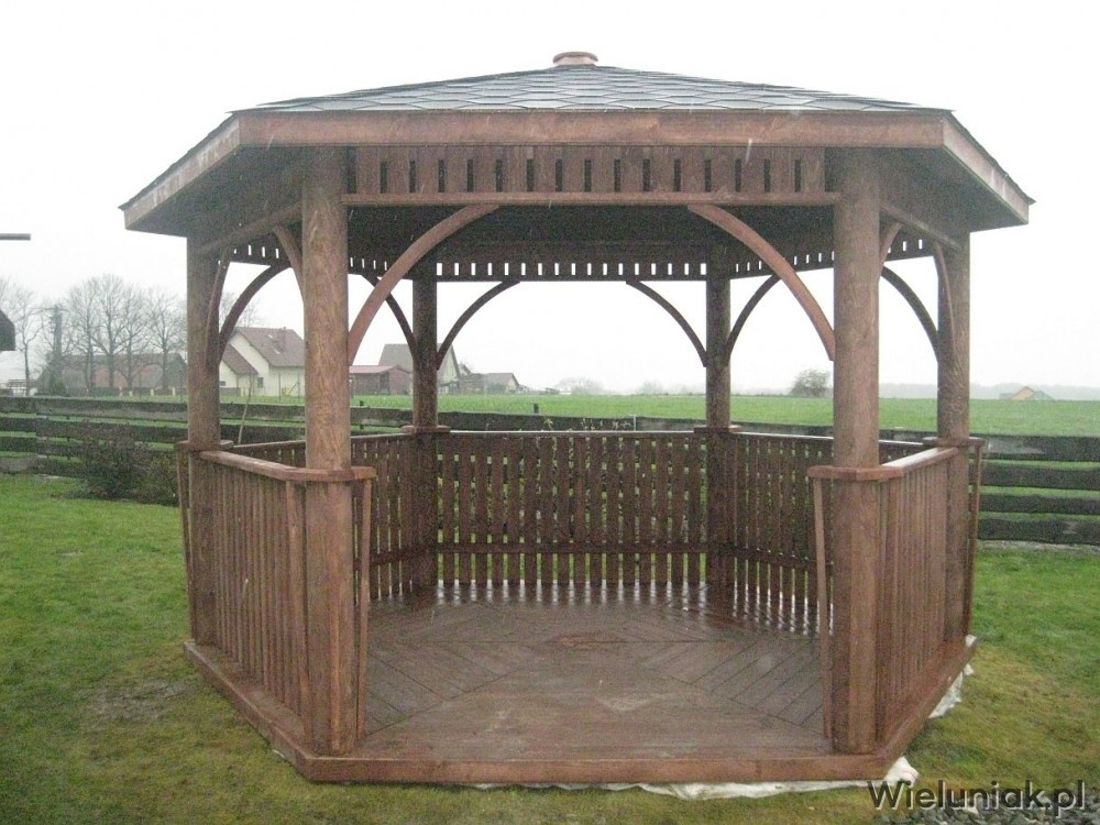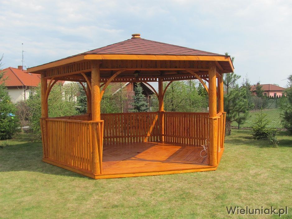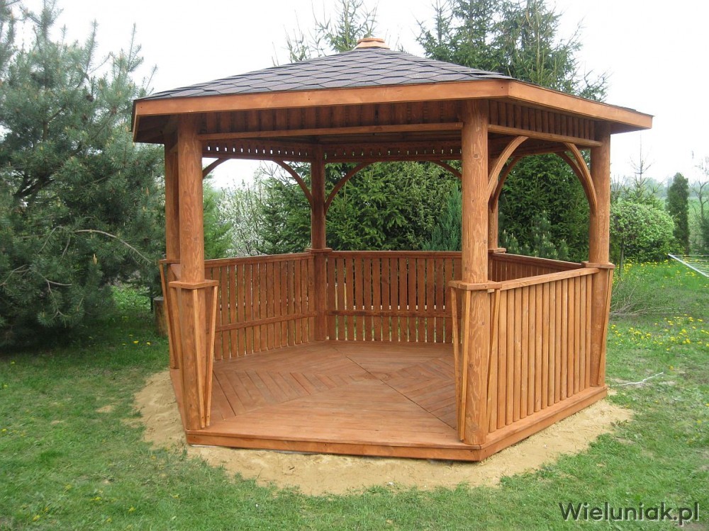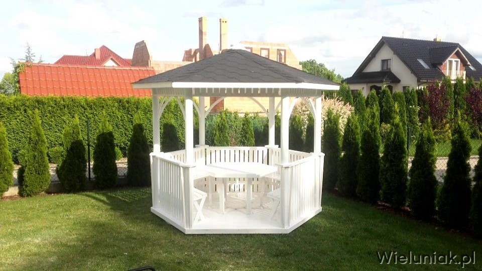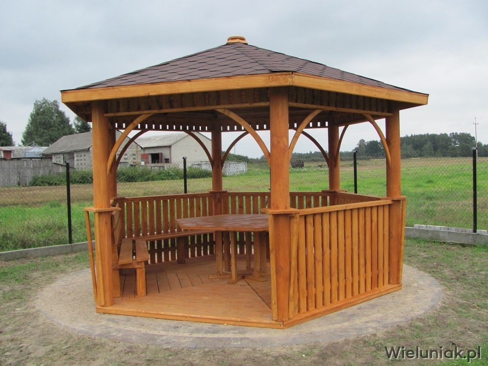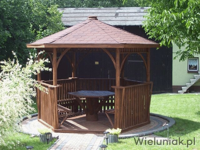 Altany ogrodowe wykonywane są z drewna sosnowego. Każda altana drewniana jest ustawiana na odpowiednio rozmieszczonych i wypoziomowanych podkładach betonowych, które zabezpieczają przed gromadzeniem się wody pod podłogą altany i zapewniają cyrkulację powietrza pod podłogą. Stosujemy również agrowłókninę, której zadaniem jest zapobieganie przerastaniu roślinności między deskami podłogowymi. Słupy altany mają wysokość 200 cm, natomiast całkowita wysokość altany wynosi 270 cm. Dachy altan wykonane są z desek boazeryjnych oraz pokryte gontem bitumicznym co zapewnia długoletnią trwałość każdej altany oraz odpowiednie wrażenia estetyczne. Każda z altan wyposażona jest w zestaw mebli, na który składają się stół z sześciokątnym blatem oraz 5 ławek, zamocowanych do altany. Wszystkie elementy altany są odpowiednio strugane oraz dwukrotnie impregnowane. Na życzenie klienta możemy zamontować w altanie oświetlenie oraz dodatkowe kratownice. Wszystkie altany montujemy samodzielnie. Dostarczamy nasze produkty na terenie Polski oraz zagranicę. Koszty transportu uzgadniamy indywidualnie z każdym klientem.