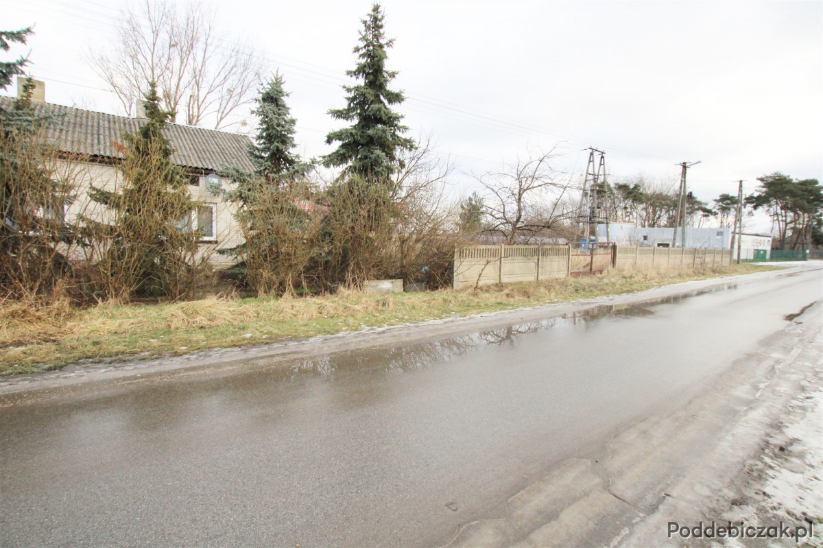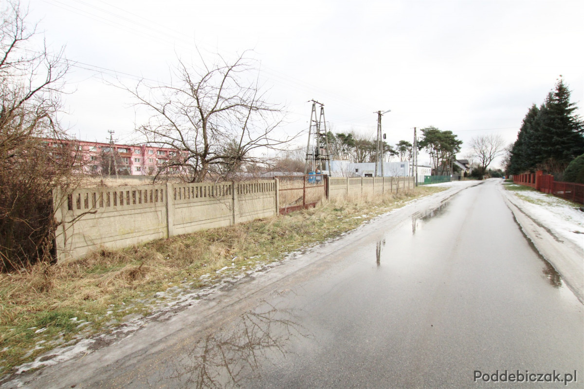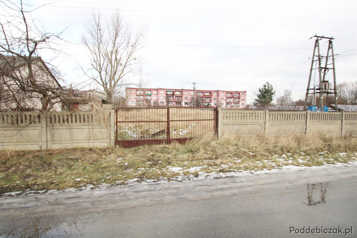 Działka w kształcie prostokąta, o szerokości frontowej 30 m, ogrodzona płotem betonowym z bramą metalową.
