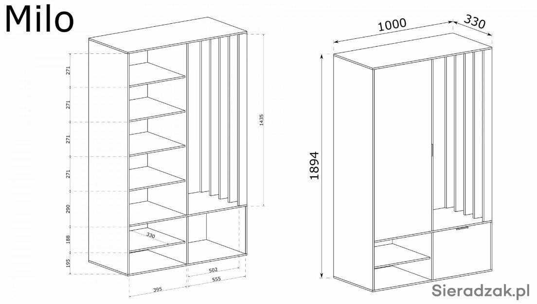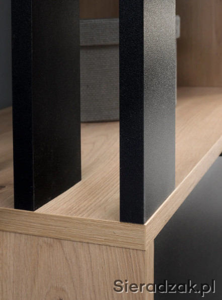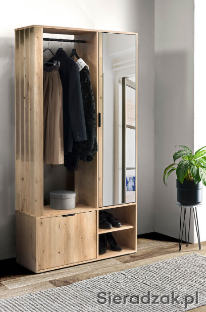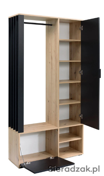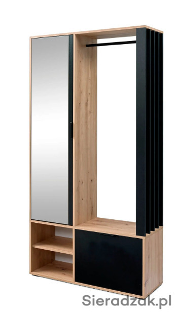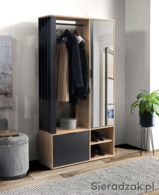 Garderoba to mebel, który potrzebny jest w każdym domu, to funkcjonalna szafa do przechowywania butów i odwieszenia kurtek na wieszaku. Nie może w niej zabraknąć lustra, w którym będziemy mogli się przejrzeć przed wyjściem z mieszkania. Nowoczesny wygląd sprawia, że garderoba wpasuje się w modowe trendy tego sezonu. Za drzwiami z lustrem znajdują się półki, które można wykorzystać do schowania obuwia dla całej rodziny. Garderoba dostępna jest w dwóch wersjach kolorystycznych: cała w kolorze Artisan i w kolorze czarnym w połączeniu z ciepłym, naturalnym Artisanem. Garderoba będzie pasować do każdego holu, jest uniwersalna, ozdobne lamele mogą być po prawej, jak i po lewej stronie. Wieszak i uchwyty są bardzo solidne i wykonane z metalu.