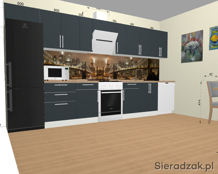 Po lewej stronie znajduje się lodówka 190*60*60. Po prawej stronie znajduje się zmywarka o głębokości 50 cm i szerokości 60 cm