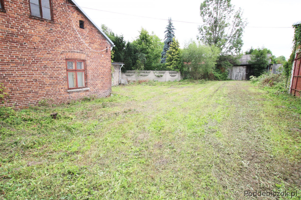 posadowiony na działce o powierzchni 0,49 ha, budynki pomocnicze- gospodarcze, stodoła drewniana oraz garaż wybudowany z pustaka.