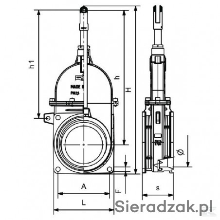 h - Odległość od środka otworu zasuwy do otworu dźwigni (pionowy) - 350 mm