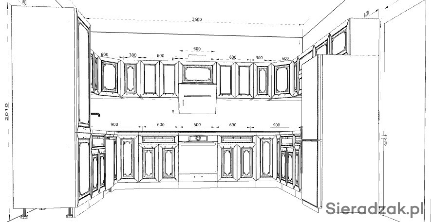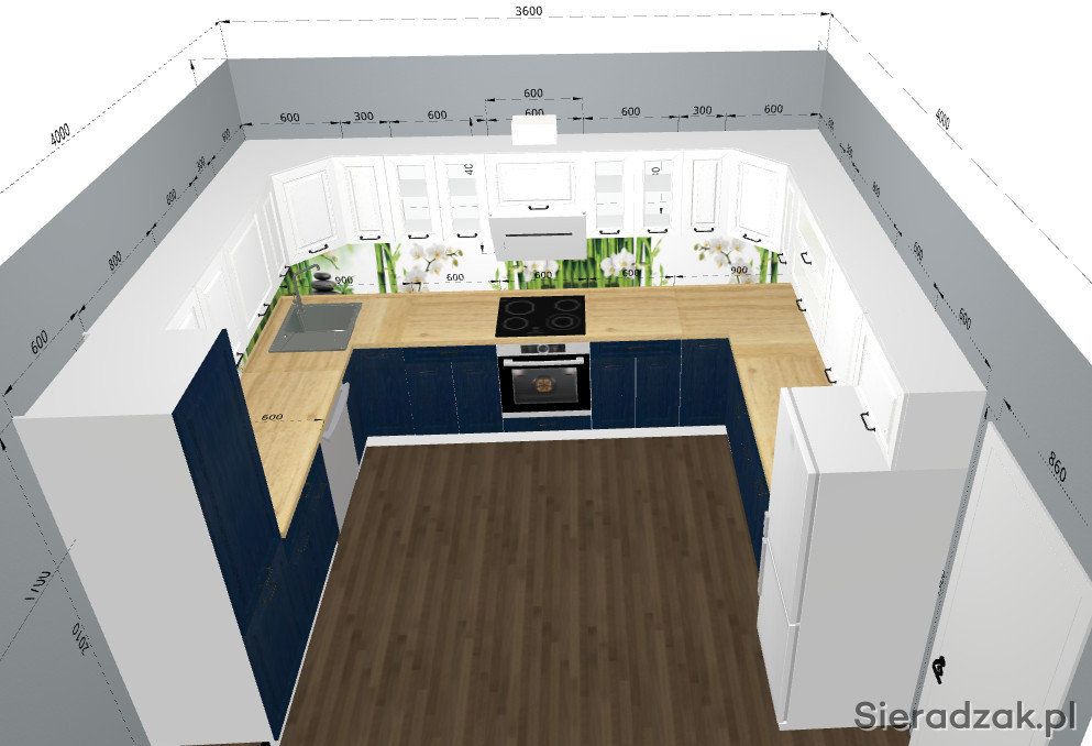Zestaw Kuchenny MADRYT 290cm*360cm*290cm z blatem to przykład kuchni wielofunkcyjnej, w której znalazło się miejsce na zmywarkę, lodówkę oraz piekarnik z płytą indukcyjną.
