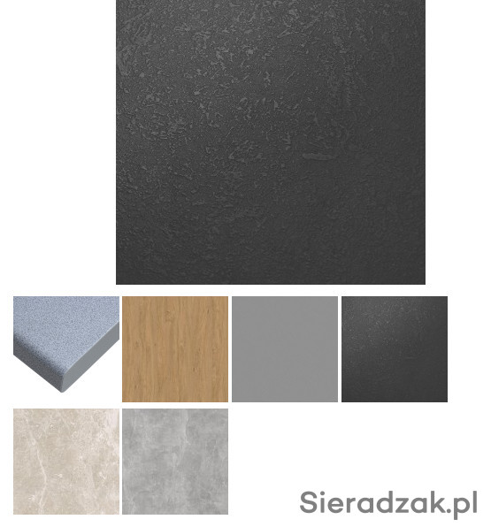 W skład zestawu kuchennego wchodzą blaty o długościach 230 cm, 230 cm, 240 cm. Grubość tych blatów wynosi 28 mm.