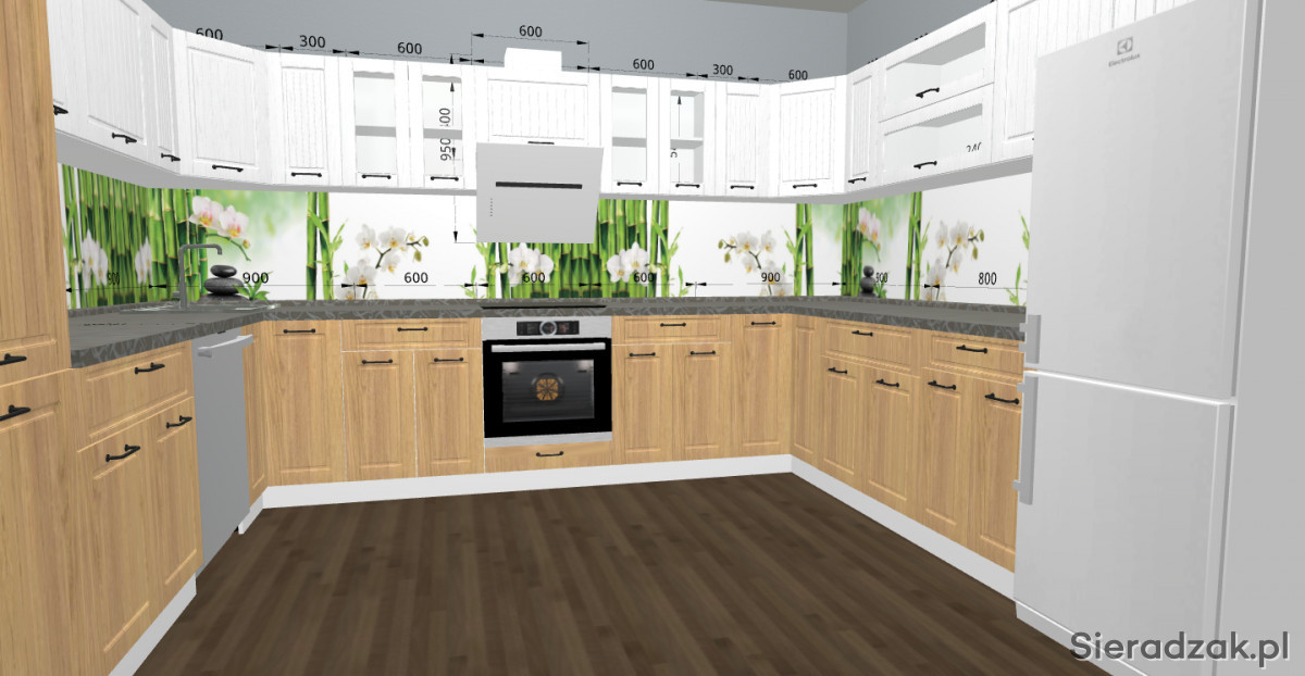 Zestaw Kuchenny MADRYT 290cm*360cm*290cm z blatem to przykład kuchni wielofunkcyjnej, w której znalazło się miejsce na zmywarkę, lodówkę oraz piekarnik z płytą indukcyjną.