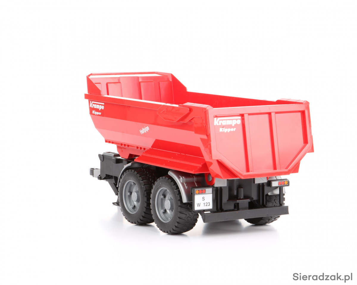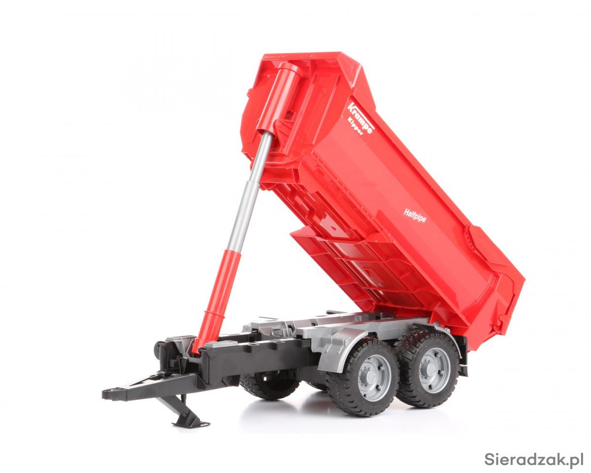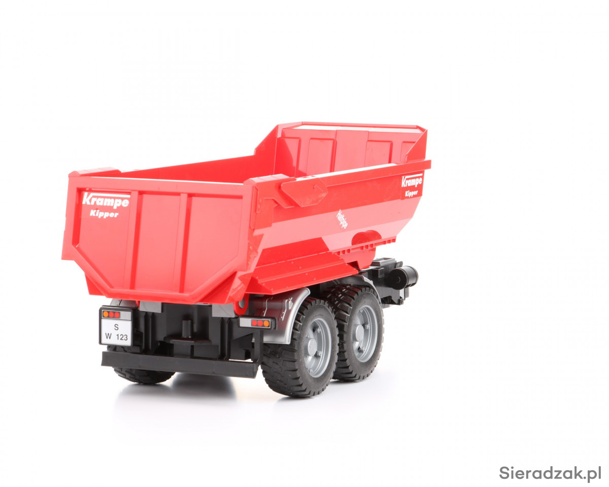 Jeśli szukasz atrakcyjnych dodatków do jednego z modeli ciągników lub innych pojazdów użytkowych Bruder, takim dodatkiem może stać się prezentowana przyczepa z wywrotem. Przyczepę możesz podpiąć do wszystkich ciągników Bruder i do części innych pojazdów tej marki. Sama przyczepa z wywrotem charakteryzuje się solidnością konstrukcji i dużą ilością niewielkich detali, które w zdecydowany sposób wpływają na atrakcyjność zabawy. Takimi detalami są m.in. koła z gumowym, miękkim bieżnikiem, centralny teleskopowy siłownik unoszący tył skrzyni do góry, co ułatwia jej opróżnianie, wysokie burty pozwalające umieścić we wnętrzu skrzyni większą ilość przedmiotów/piasku, a także uchylana tylna burta umożliwiająca szybki rozładunek przyczepy. Przyczepa to rodzaj zabawki dla chłopca, który dysponuje już jednym z ciągników Bruder. W ostateczności przyczepa może być traktowana jako zabawka samodzielna.