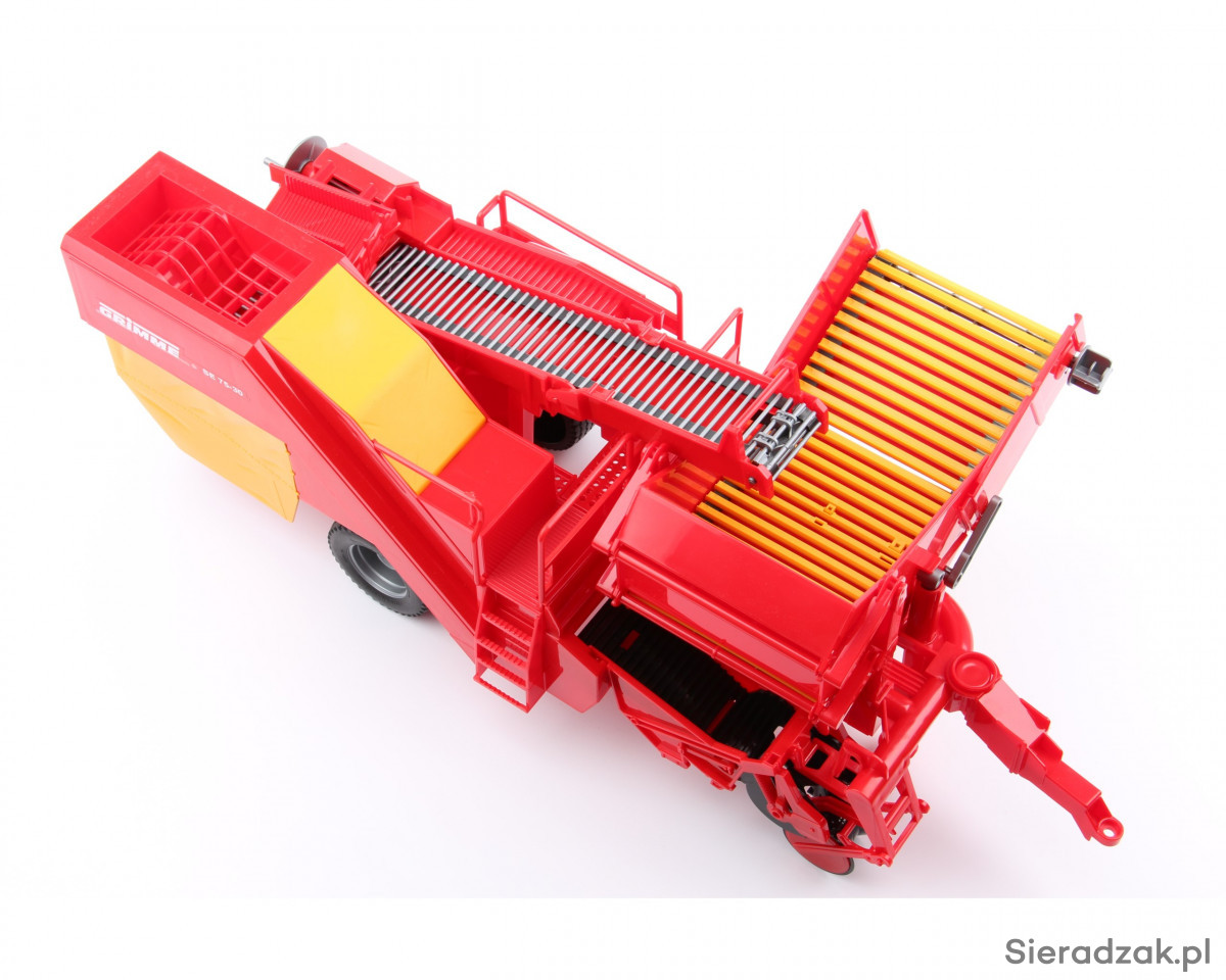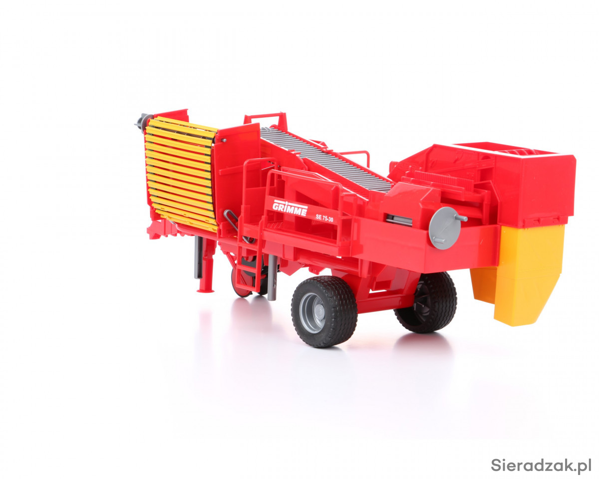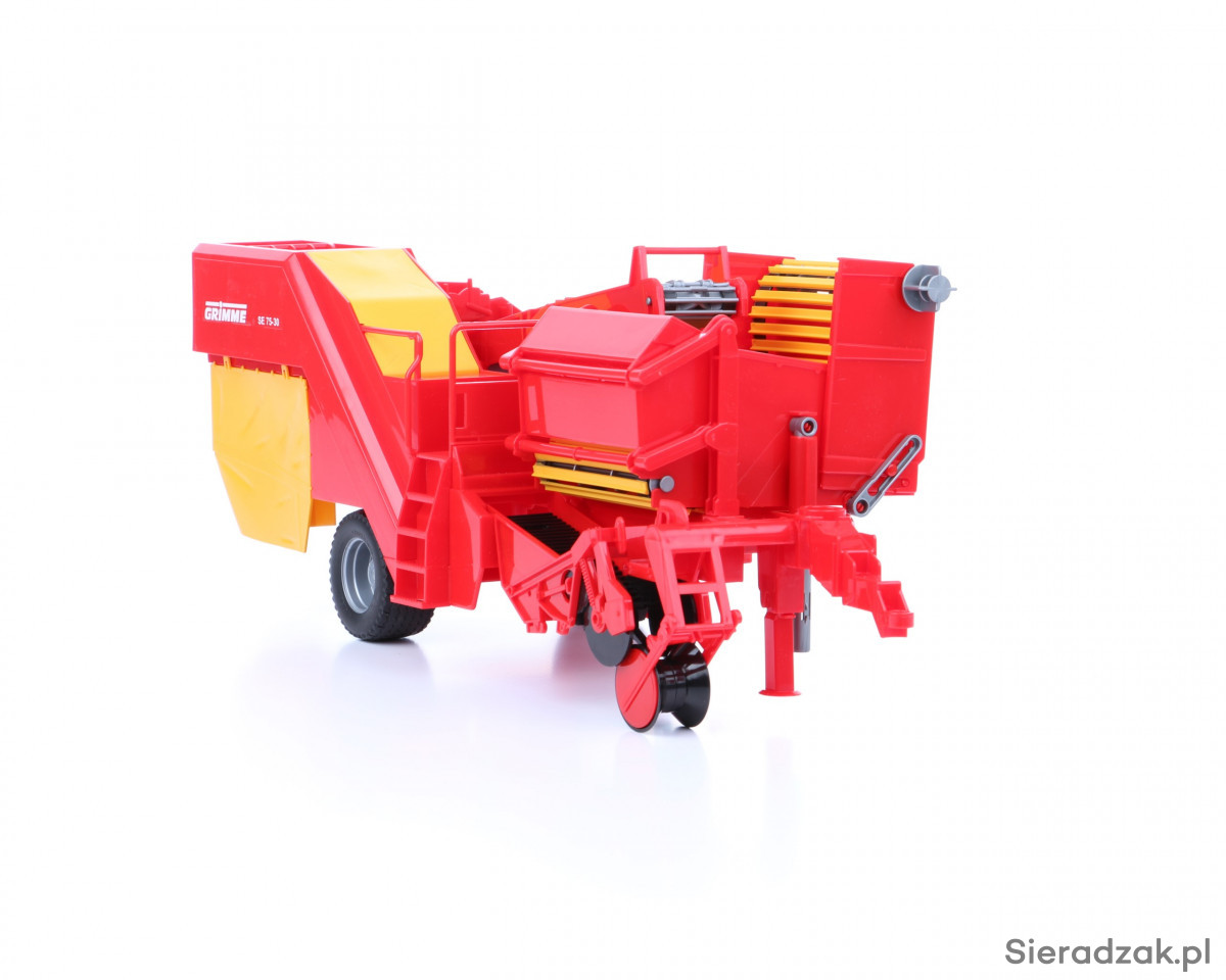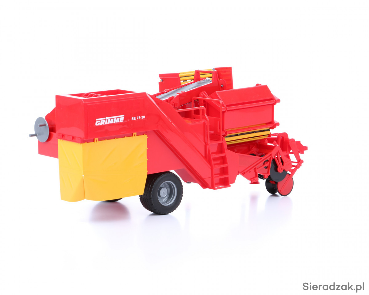Wiernie odwzorowane modele popularnych maszyn rolniczych to znak rozpoznawczych firmy Bruder. Zabawki tej marki wyróżniają się niezwykłą szczegółowością, wysoką precyzją wykonania oraz zaskakująco dużą liczbą oferowanych funkcji. Takie modele maszyn rolniczych jak prezentowana kopaczka do ziemniaków Grimme standardowo wyposażone są w wiele ruchomych elementów, a także w elegancko wykończone, gumowe koła z wyraźnie zarysowanym bieżnikiem. W przypadku tej konkretnej zabawki Bruder, na wspomnienie zasługuje chociażby ruchomy, gumowy pas transmisyjny to przesypywania ziemniaków, który można obsługiwać przy pomocy specjalnego pokrętła, a także ruchoma podpora przednia, która pozwala ustawić maszynę w pozycji wyjściowej, już po jej wypięciu z ciągnika. W skład zestawu wchodzą także miniaturowe, plastikowe ziemniaki, co w pozytywny sposób wpływa na atrakcyjność zabawy.