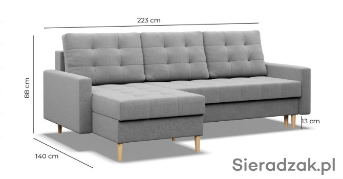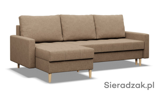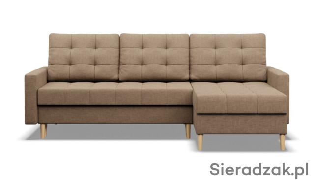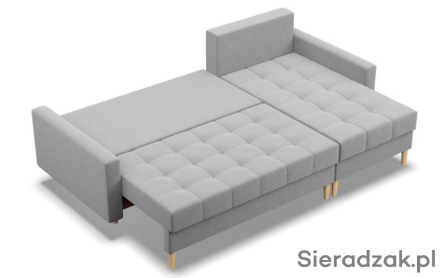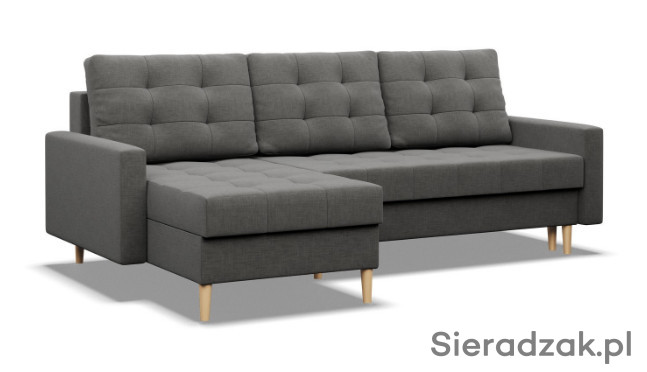 Uniwersalny narożnik pozwala na wybór strony – prawą lub lewą – tuż przed montażem, co czyni go wyjątkowo elastycznym w dopasowaniu do każdej przestrzeni. Pikowane siedzisko oraz dwustronne poduszki w skandynawskim stylu nadają mu elegancki wygląd. Wysokie, drewniane nóżki z bukowego drewna podkreślają lekkość mebla, nadając mu subtelny, a zarazem nowoczesny charakter.