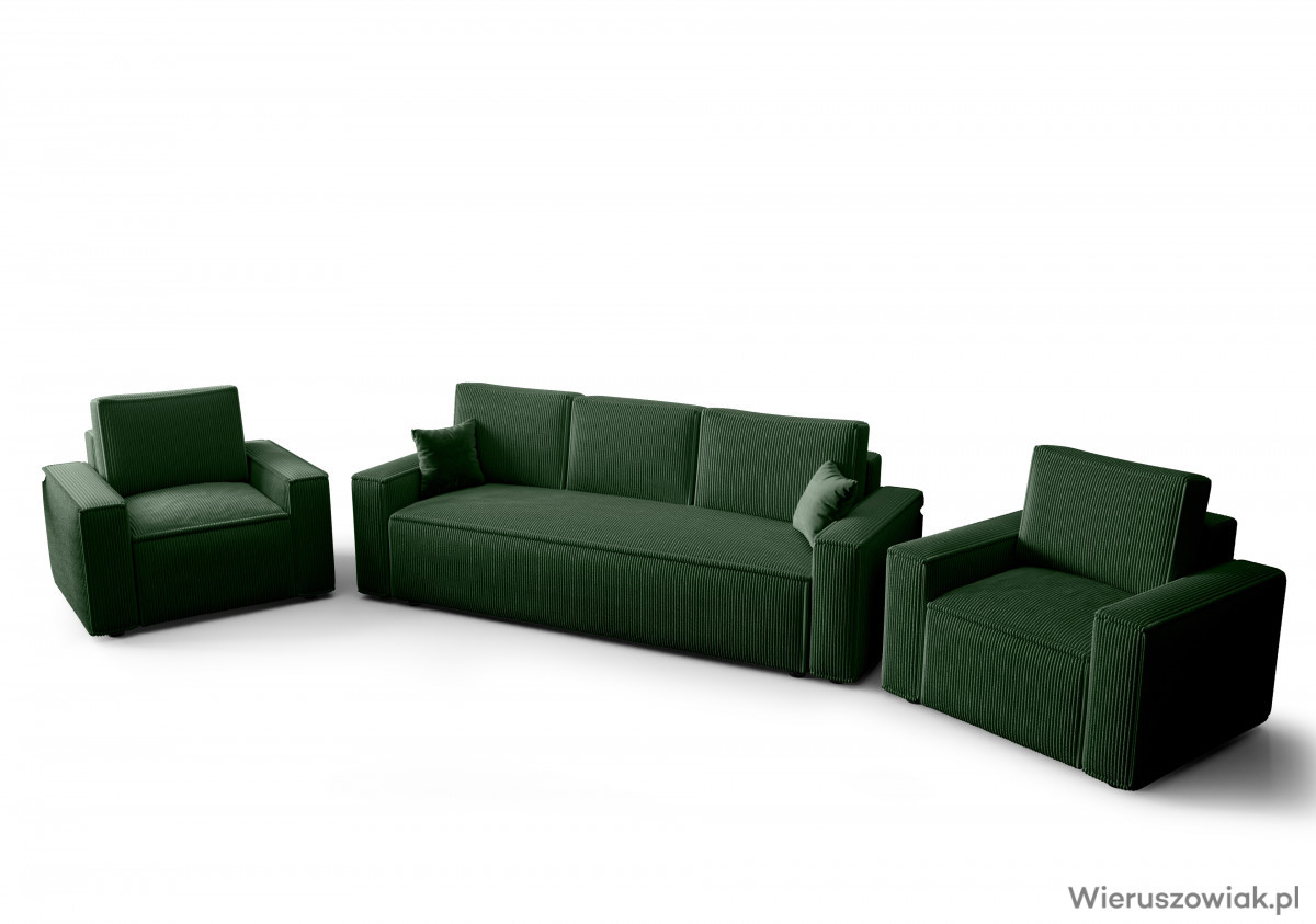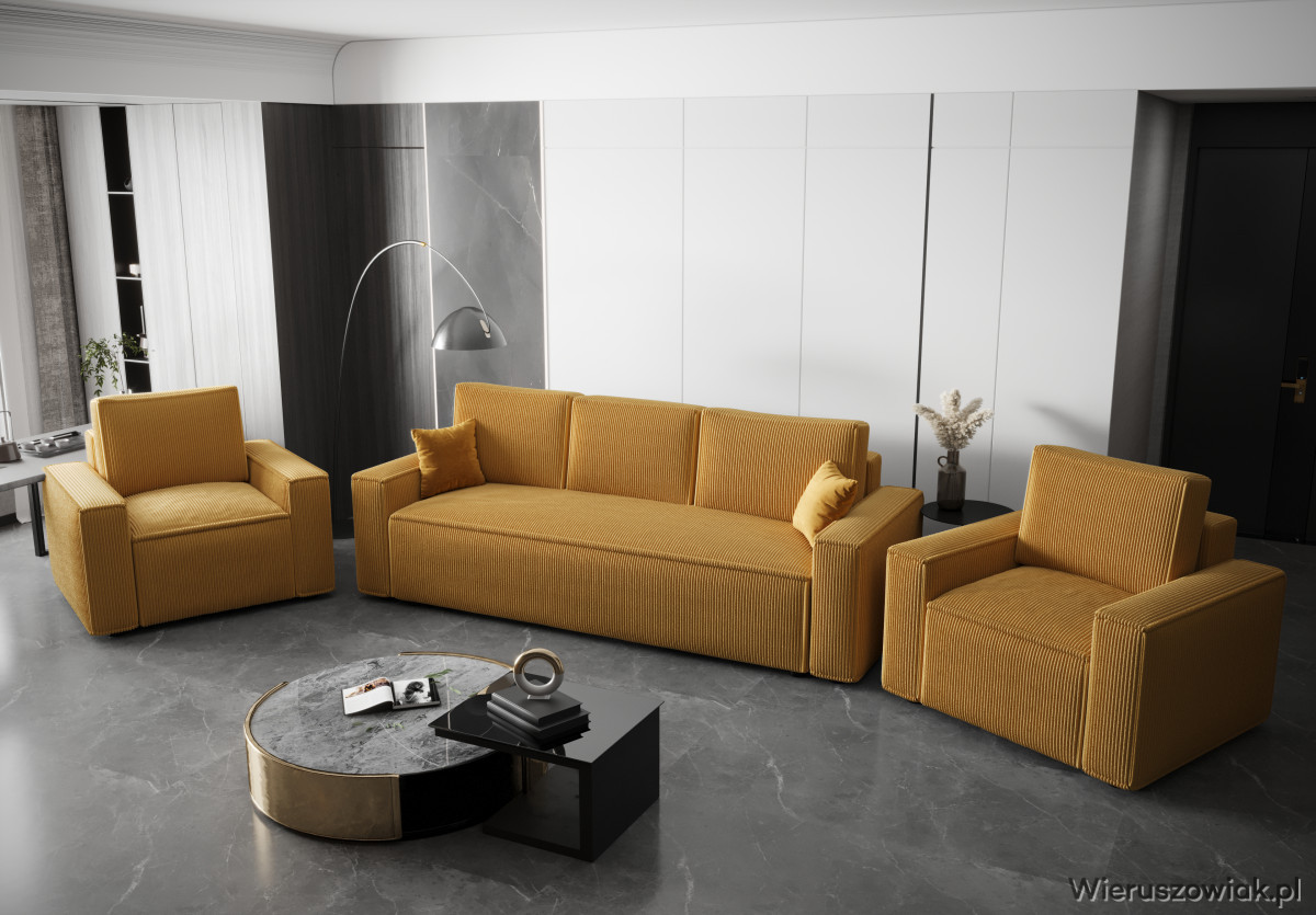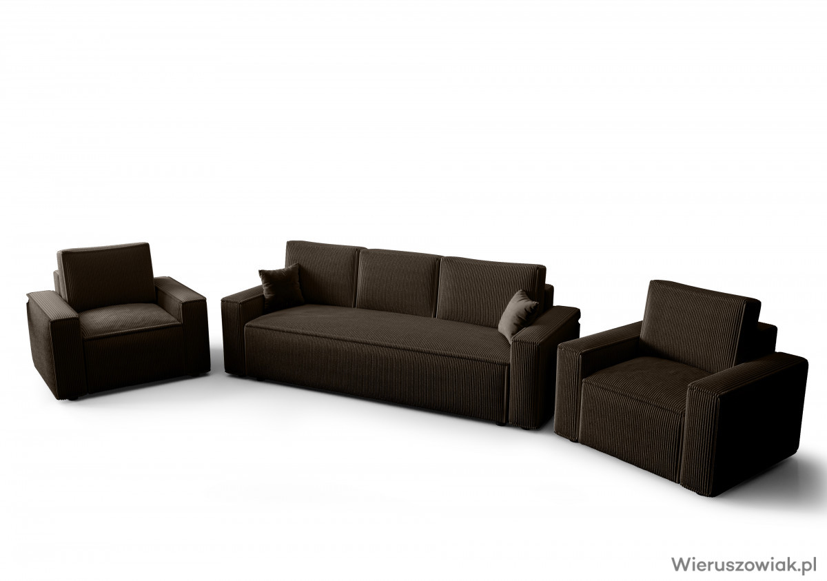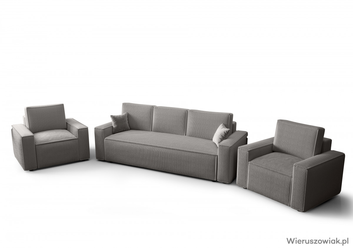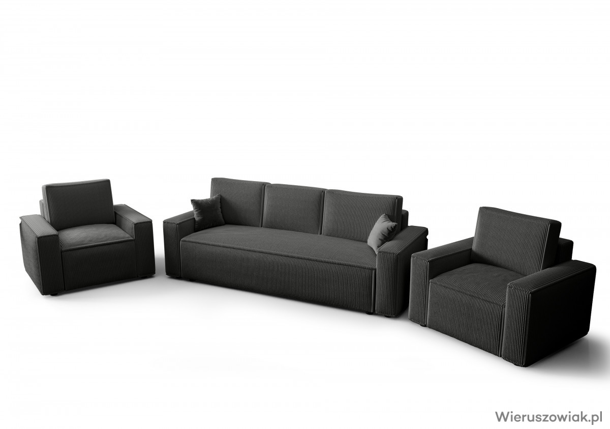 Zestaw mebli tapicerowanych AMBRO to harmonijne połączenie nowoczesnego designu i wysokiej funkcjonalności, stanowiące doskonały wybór do każdego współczesnego wnętrza. Składa się z komfortowej sofy z funkcją spania i pojemnikiem na pościel oraz dwóch wygodnych foteli pokrytych tkaniną sztruksową POSO, która zapewnia nie tylko elegancki wygląd, ale również wyjątkowy komfort użytkowania.