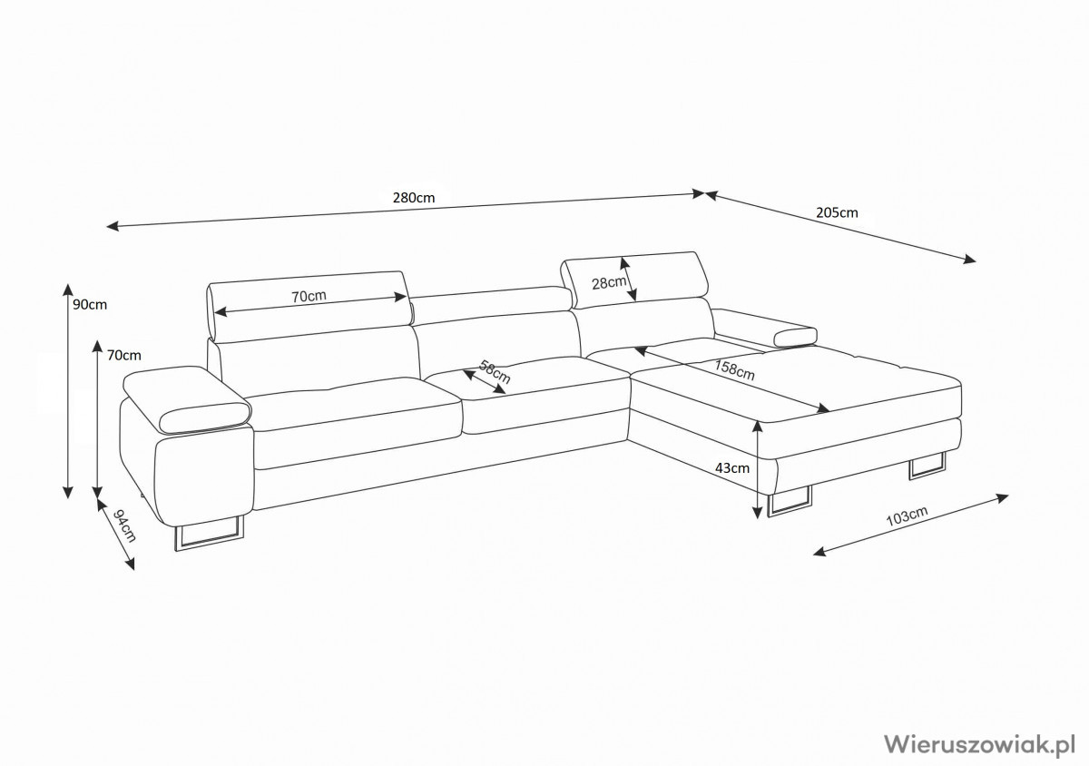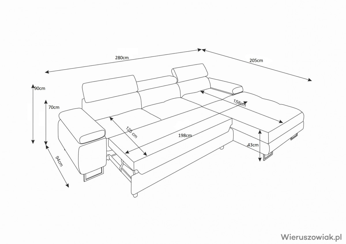 Pojemnik na pościel w otomanie: Narożnik wyposażony jest w praktyczny pojemnik na pościel, zlokalizowany w otomanie. To doskonałe rozwiązanie na przechowywanie pościeli, koców czy poduszek, co pozwala na utrzymanie porządku w salonie i efektywne wykorzystanie przestrzeni.