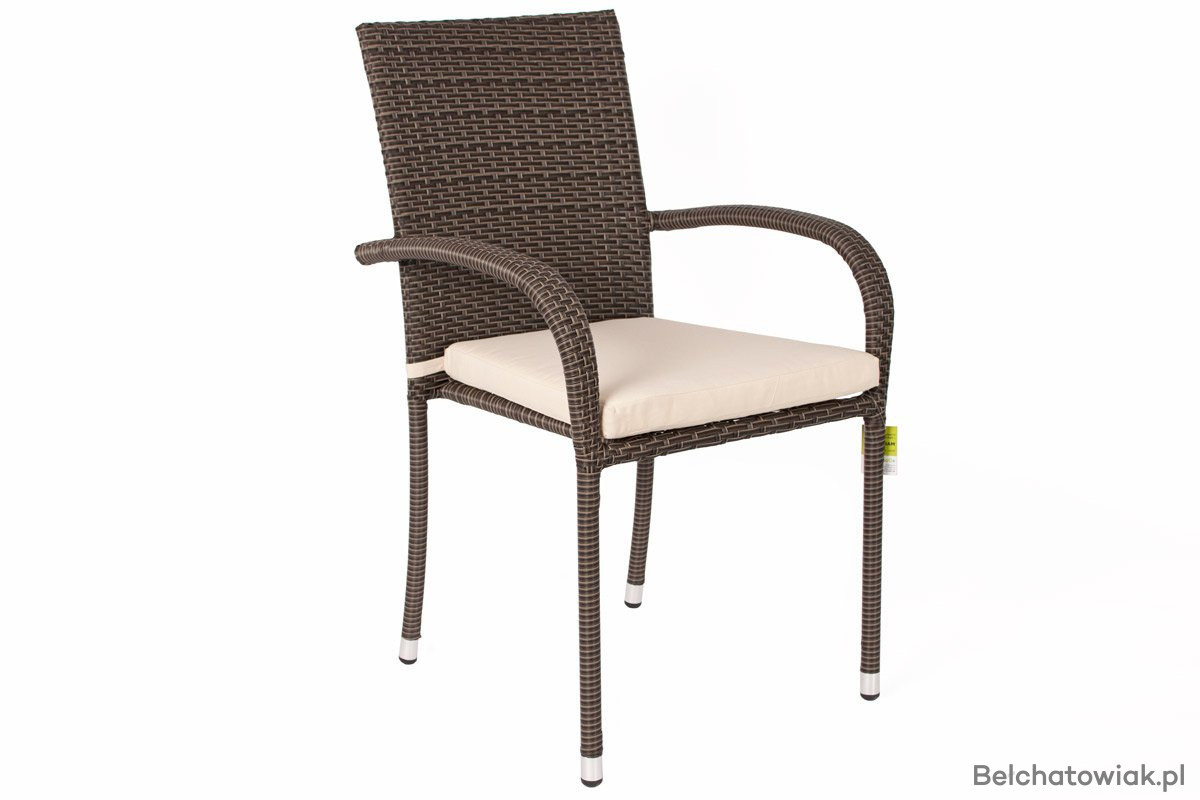 Krzesło ogrodowe z technorattanu w odcieniach brązu. Bardzo dobrze wyprofilowane z podłokietnikami zwiększającymi komfort siedzenia. Eleganckie i stylowe krzesło ogrodowe z miękką poduszką.