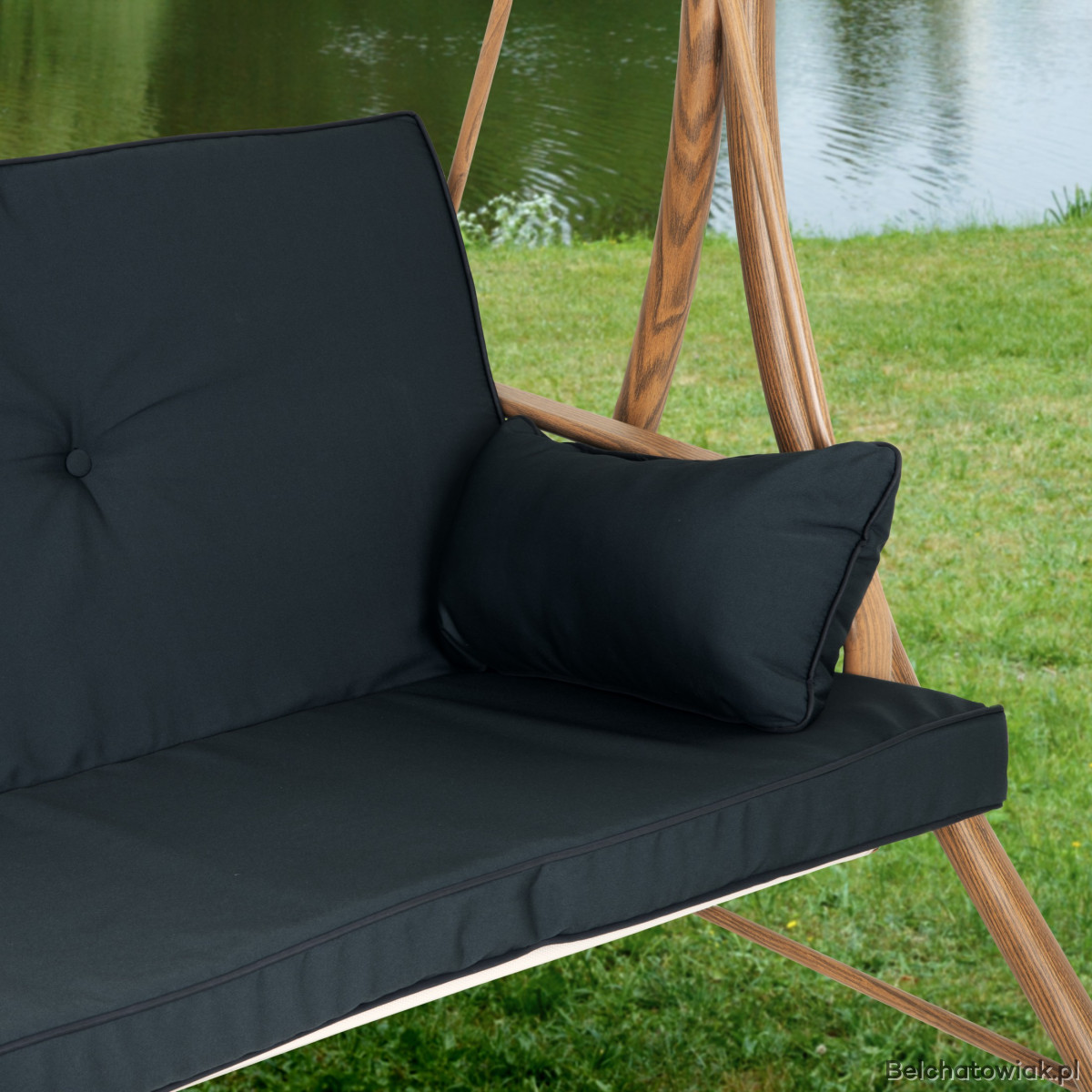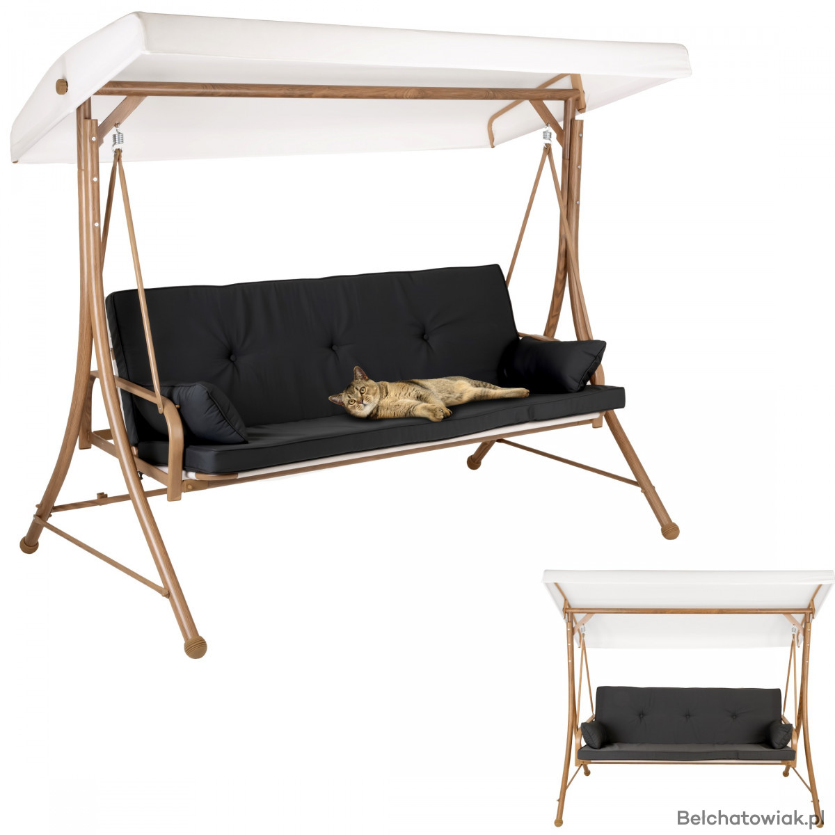 Wolnostojąca konstrukcja z trwałej stali daje pewność stabilności i bezpieczeństwa. Materiały zastosowane w dachu i siedziskach – wytrzymały poliester – zapewniają wygodę i odporność na warunki atmosferyczne. Co więcej, huśtawka rozkłada się na płasko, zamieniając się w idealne miejsce do leżakowania, drzemki czy wspólnych rozmów.