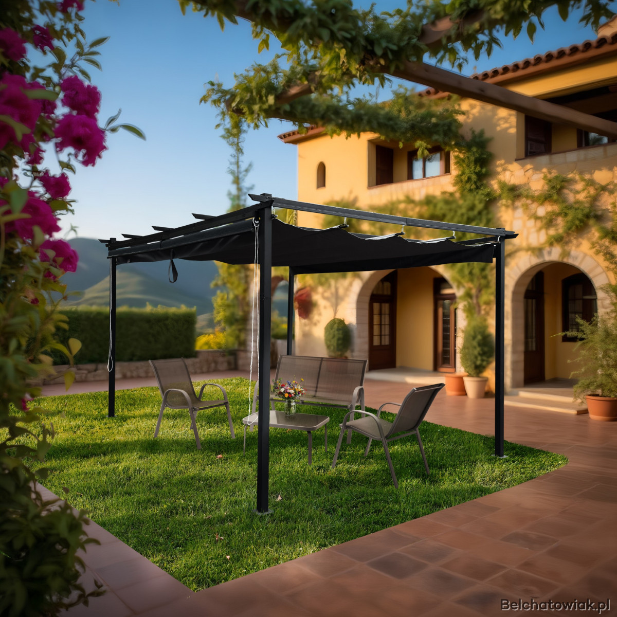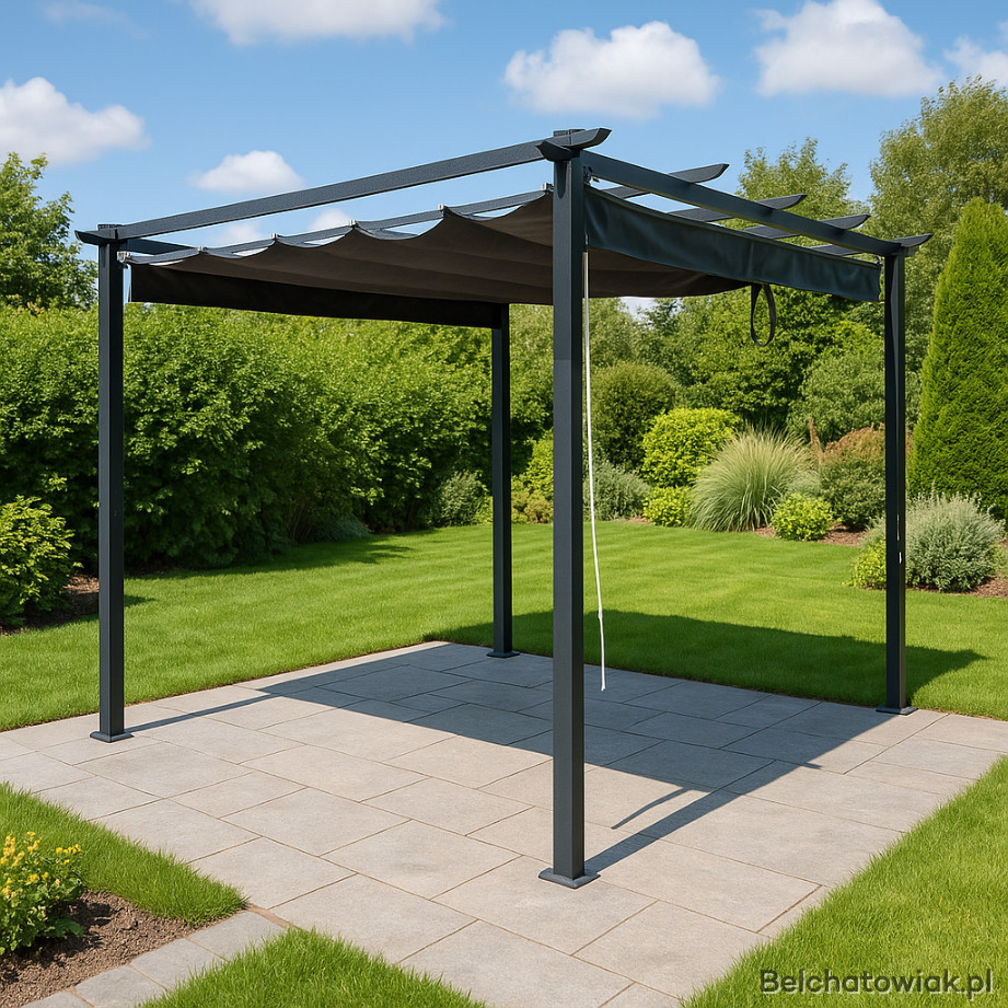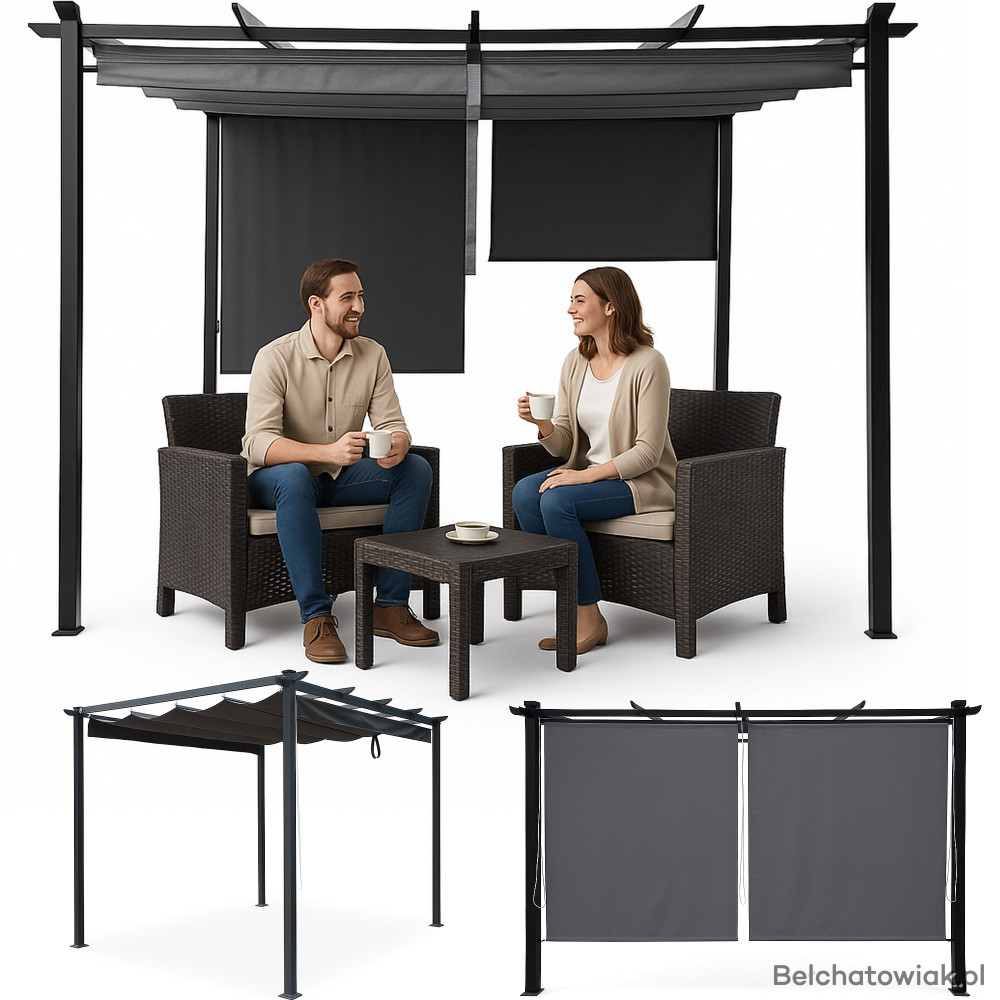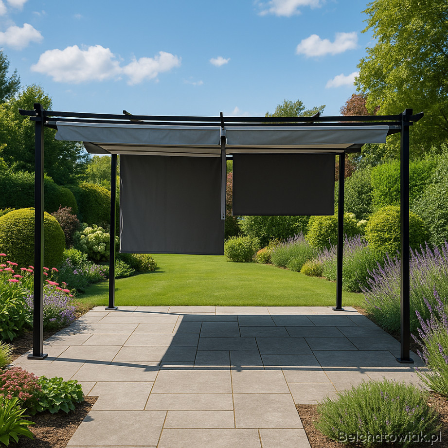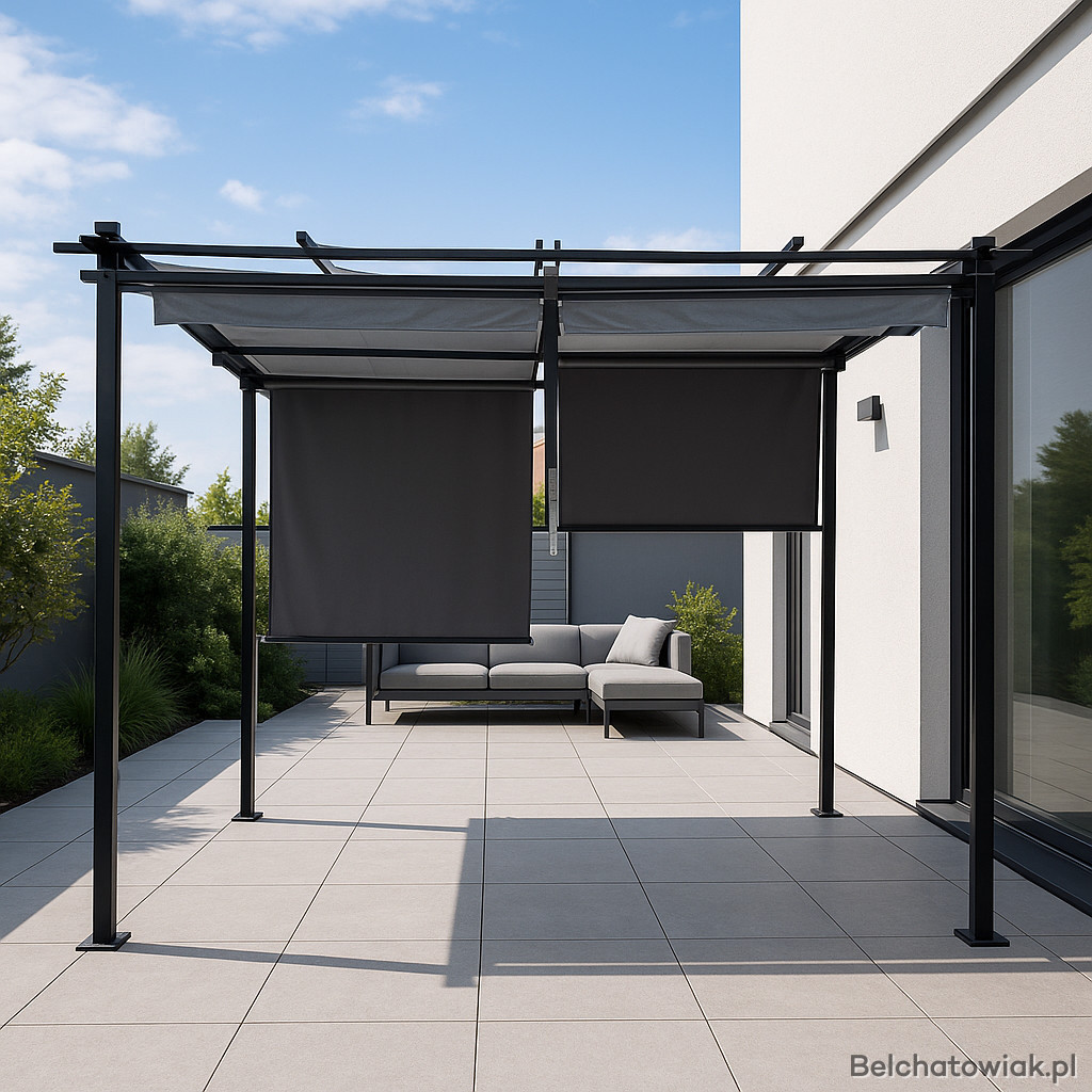 Ta solidna pergola ogrodowa z 4 bocznymi markizami stworzy idealne miejsce, w którym znajdziesz cień, prywatność i wyjątkowy styl.
