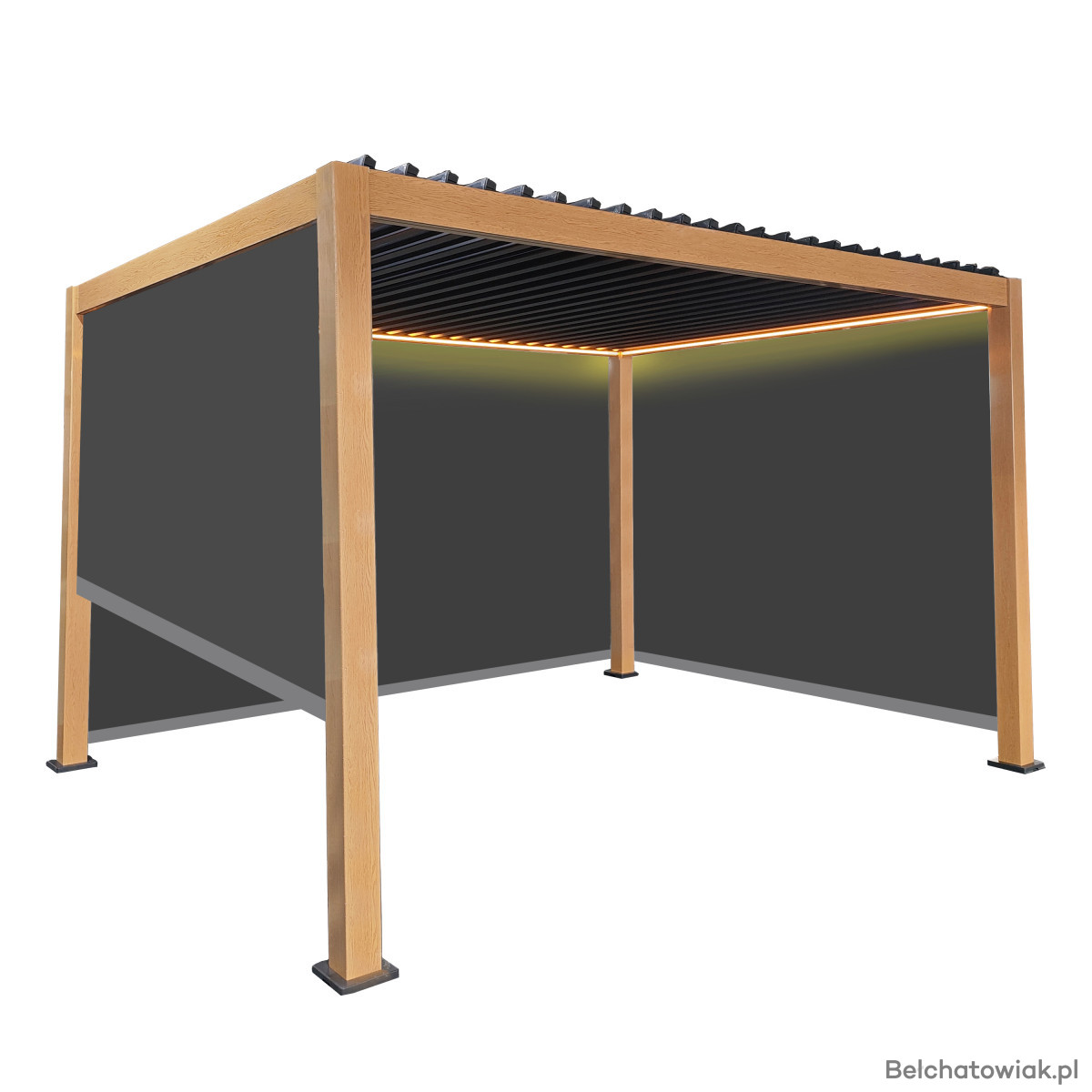 Pergola aluminiowa 3x4 m z elektrycznie sterowanymi kurtynami i zintegrowanym oświetleniem LED to maksimum funkcjonalności i stylu.