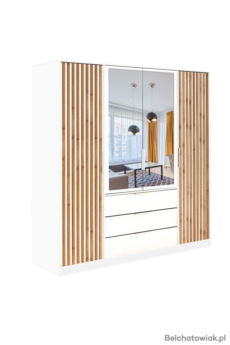 Szafa czterodrzwiowa z lustrem i lamelami – biały,dąb wotan