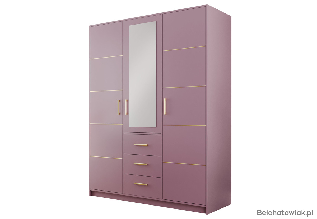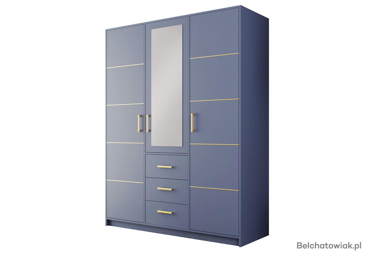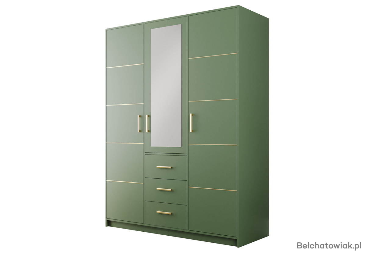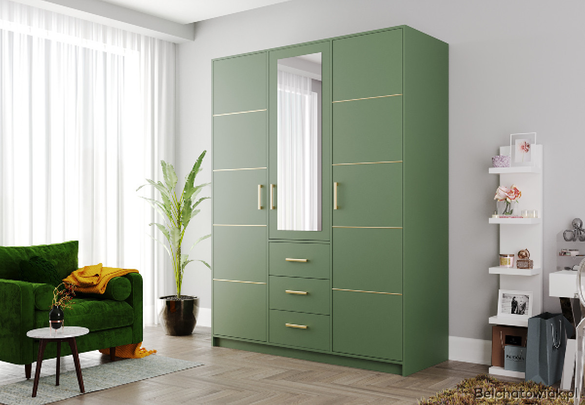 Szafa trzydrzwiowa z lustrem i złotą listwą – śliwka, butelkowa zieleń, zgaszony błękit