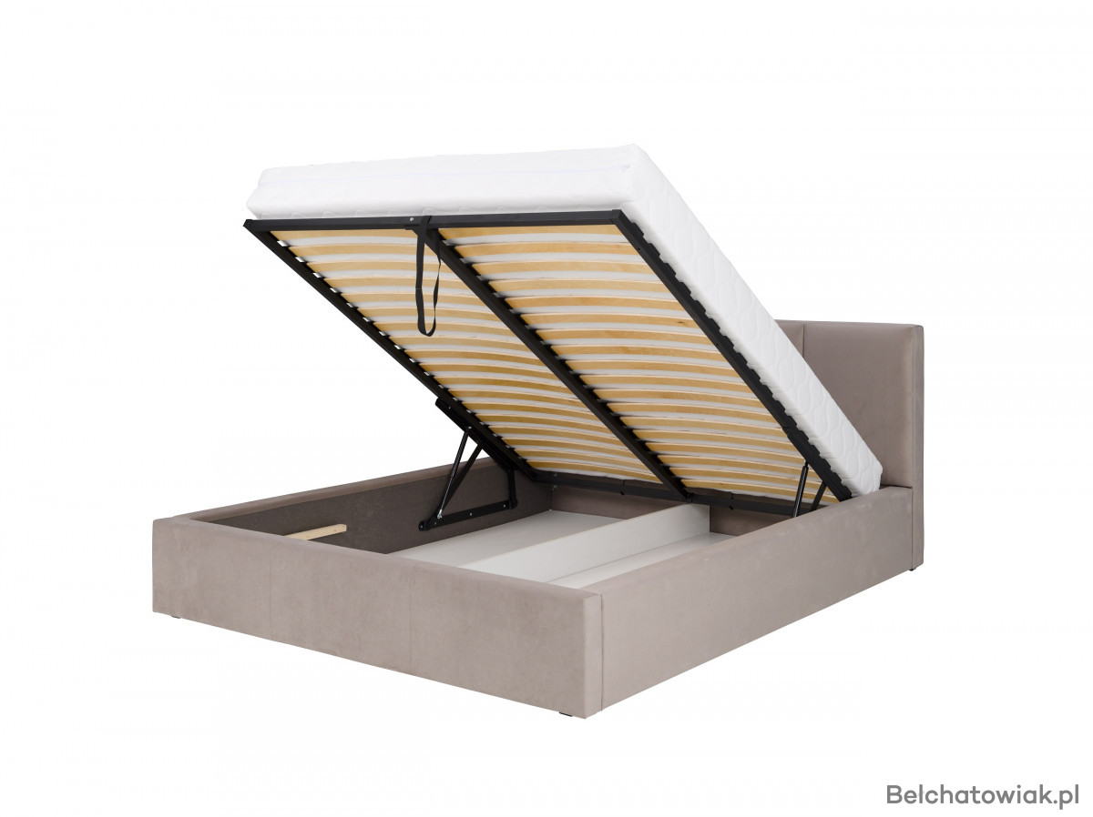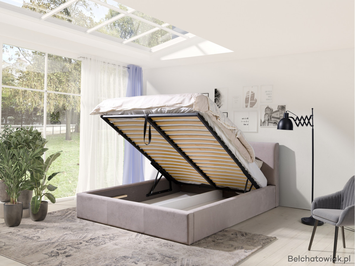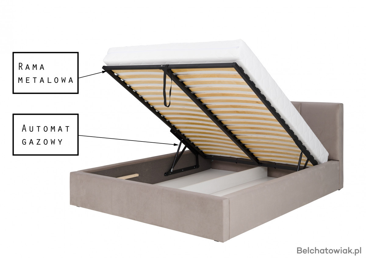 Dodatkowym atutem jest pojemny schowek na pościel, otwierany od frontu – praktyczne rozwiązanie, które ułatwia przechowywanie.