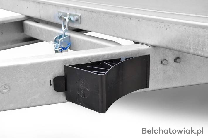 4. Konstrukcja skrzyni ładunkowej oparta jest na dodatkowej ramie z wysokojakościowej stali o grubości 2,5 mm. Takie rozwiązanie to gwarancja jakości, ponieważ stalowa rama pełni funkcję dodatkowego wspornika pomiędzy skrzynią ładunkową i dyszlem naczepy. Wśród wielu konkurencyjnych rozwiązań brakuje tego ważnego elementu konstrukcji, a ramę całej przyczepy tworzy połączenie dyszla bezpośrednio z podłogą.